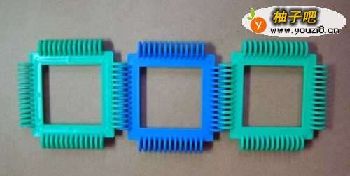 2这里先拼装金色的娃娃的前面的部分。由三个正方形积木所组成。摆放的位置,如下图所示。