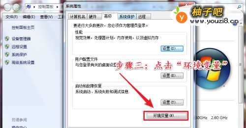 3进入“高级系统使用”面板以后,继续点击面板下方的“环境变量”选项。