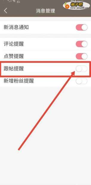 6来到消息管理,然后把【跟帖警告】的按钮开启就能了。