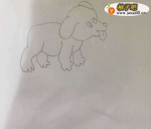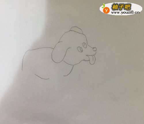 3接着画出狗的身体轮廓,如下图所示。狗的身体最大高度建议参考狗的脑袋高度;狗的身体宽度建议参考1.5倍的脑袋宽度。