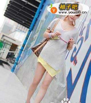 4纯灰色t恤搭配黄色不规则裙子露出膝盖显高又显瘦觉得是矮个子mm首选搭配