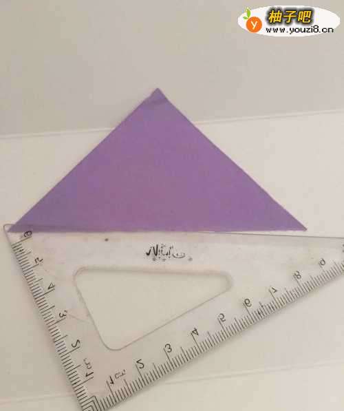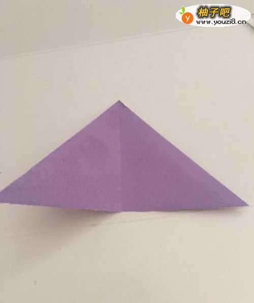 第一步 把一张7.5厘米X7.5厘米的正方形彩纸 折成两页三角形裁开 左右对角折叠后 取开