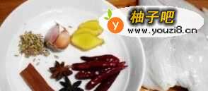 3把姜片、蒜片、八角、桂皮、茴香和干辣椒放碗里,加酱油、白糖、料酒和黑胡椒粉调好汁;