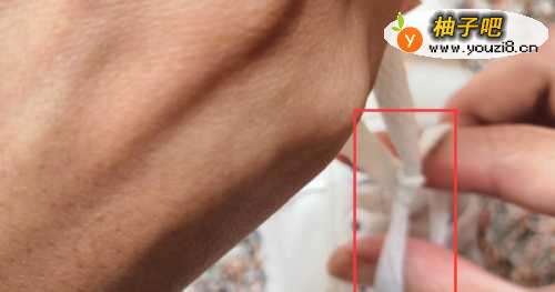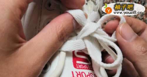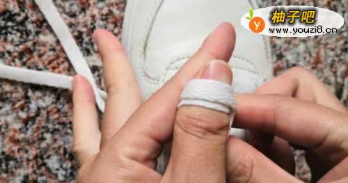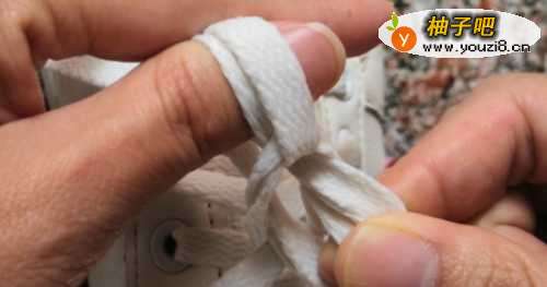 4同时左手大拇指放在将余下的鞋带的下方,见下图展示