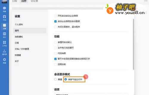 4在会话显示模式界面,勾选【消息汽泡左对齐】,点击【X】关闭窗口即可。