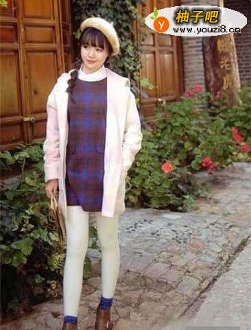 10搭配要点:白色衬衫+格子连衣裙+白色裤袜+粉色格子大衣+棕色短靴+米黄色画家帽