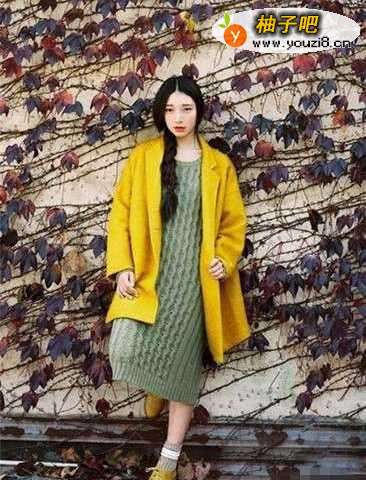 6搭配要点:绿色针织连衣裙+黄色毛呢大衣+灰色短袜+土黄色绑带牛津鞋