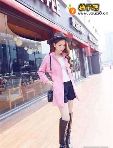 9搭配要点:白色打底衫+黑色短裤+粉色针织大衣+黑色长靴+黑色软呢帽+黑色小挎包