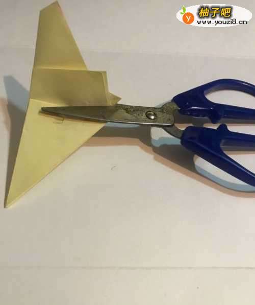 4第四步 与双边对齐折好之后 再把它左右翻过来 从右向左对折 然后拿起手工剪刀顺斜边剪去
