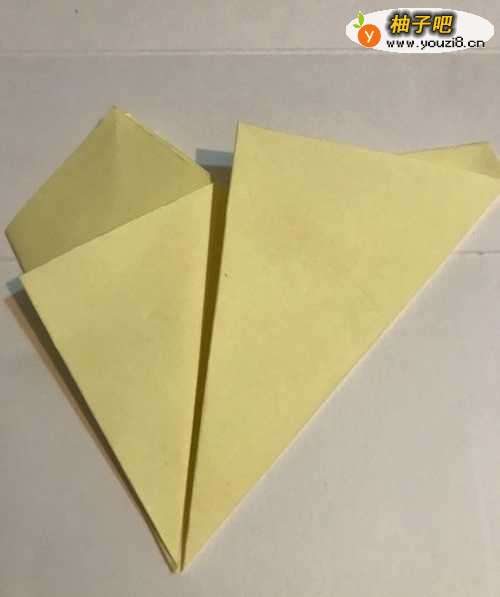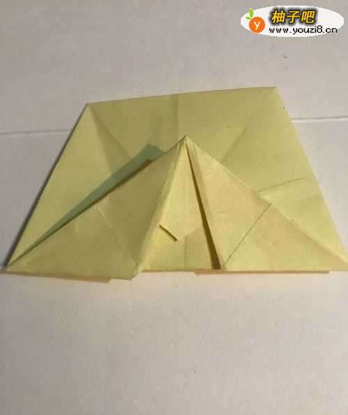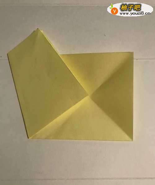 第一步 将一张长X宽16厘米的正方形黄色彩纸 从下向上对折 然后再拿起右上角向下对折