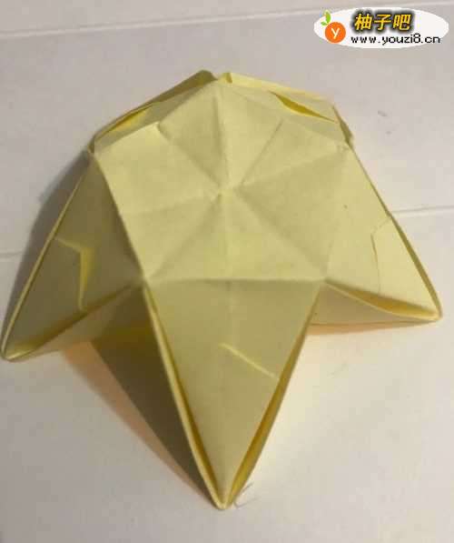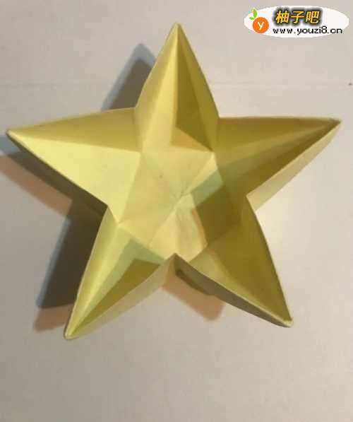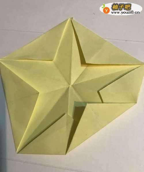 9第九步 捏折好五角正方体之后 再把它翻过来 五角聚拢折叠 均匀的捏折成同样大小 再调整一下 一个漂亮的五角星盒子就折叠完成争冷了