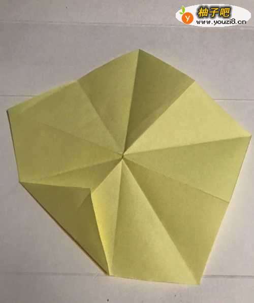 7第七步 折好之后 把它翻过来 然后拿起著睡娃任意一个角向上折叠 它的折痕两端是左右两个外角 其它四个角同样折叠整齐
