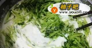 面粉倒入盆中,加水搅成面糊,把做好的萝卜丝加进去搅拌。