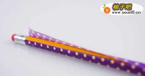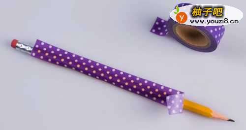 33.旋转铅笔,轻轻地将胶带按压在其他边缘上。如果胶带的宽度小于铅笔的周长,就需要拿起第二张胶带,并将其贴在铅笔的未覆盖部分上,尽可能地对齐图案。