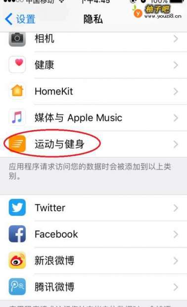 3隐私页面下找到“运动与健身”