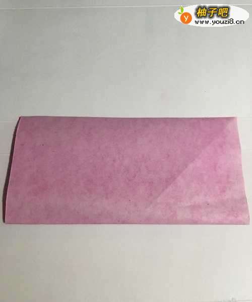第一步 把一张16厘米X16厘米的正方形二红色彩纸 从下向上对边折叠整齐