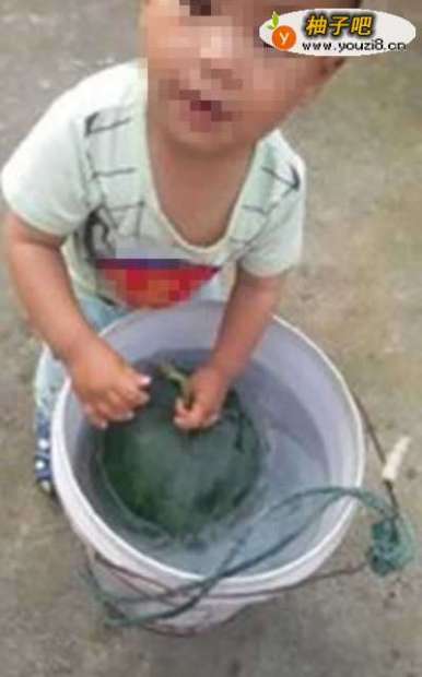 3把西瓜倒立,整个放入水桶里浸泡,要把西瓜全部浸透。