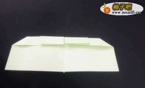 3再次将纸对折折好后压平。将最上层的两个小长方形开启。将内侧的角分别往左往右压平。