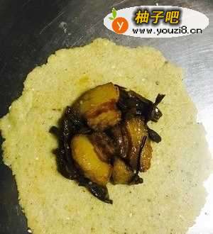 4放上梅干菜烧肉,像叠被子一样折叠包起来,折成四方形