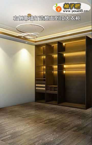 精装房主卧怎么改造呢?首先右侧靠墙打造整面到顶大衣柜,短衣区、叠放区和抽屉必不可少。柜门采用玻璃推门设计,更具高级感,拿取衣服也更方便。