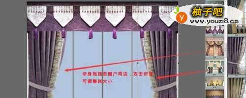 3再直接将看好的帘身拖拽于窗户两边,鼠标双击帘身,出现虚线框,此时可对帘身大小进行调整,使其看起来更美观看。调整好之后,再选择合适的窗纱,效果如图所示,窗帘设计完毕,点击左上角保存;