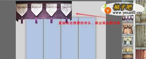 2直接点击选好的帘头,鼠标右击帘头,选择“满铺”,再双击帘头,出现右下角工具框,我们选择帘波及旗子,使帘头正确满铺于窗户上;