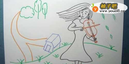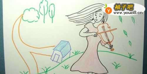 简笔画能直接用彩色笔绘画,可先用铅笔在白纸上画出草图,接着用不同的彩色笔绘制出线条,根据不同的图形采用不同的颜色,但要注意色彩的搭配和谐。这里给大家分享彩色简笔画,拉小提琴的姑娘,大家也来画画吧。