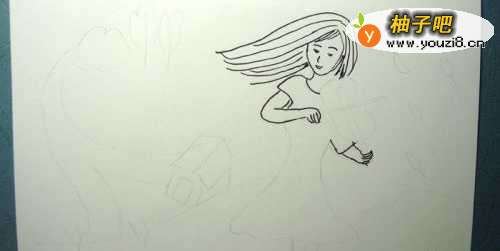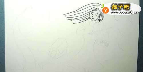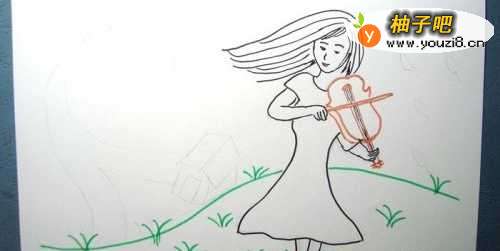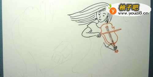 2接着,用黑色的彩色笔画出姑娘的肩膀和手臂图形部分出来,注意要画出拉小提琴的手势,如下图所示。