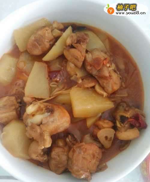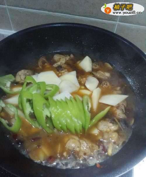 4锅中加入热水,不能加凉水,不然鸡块就不会熟了,加水没过鸡块,小火慢炖,当你用筷子很轻松的能插穿鸡腿肉的时候,鸡肉基本已经熟了,这时候开始加入土豆和青椒。