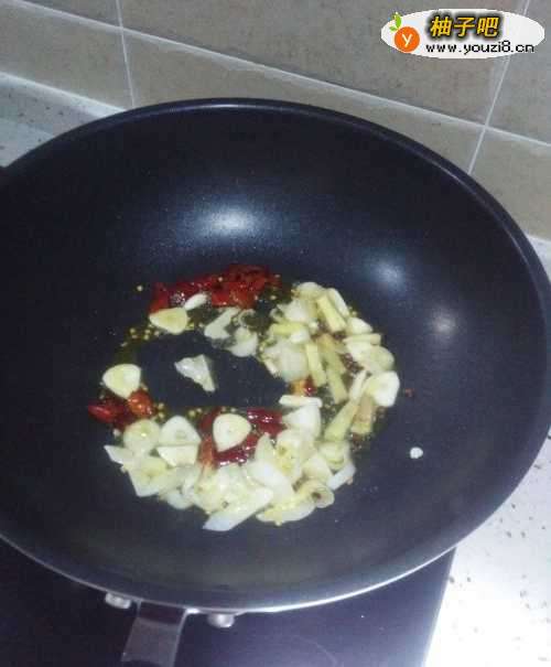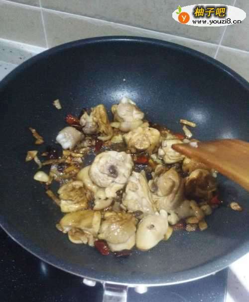 3不粘锅烧油,加入刚才准备的葱姜蒜,花椒麻椒辣椒,爆香。也能加入少许豆瓣酱,豆瓣酱容易烧糊,所以要提前加,炒出香味之后,放入已经漓干水分的鸡块,爆炒,放入酱油,炒出味道,颜色编程稍微金黄。