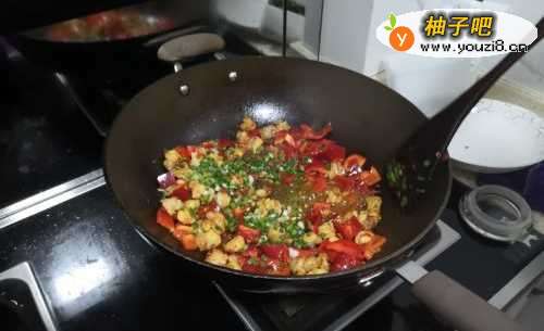 8加入葱花和红椒,进行翻炒。