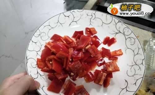 3将红椒切成小块状,大小于掌中宝类似。