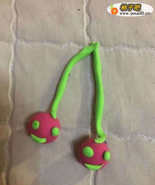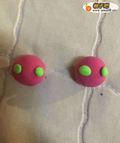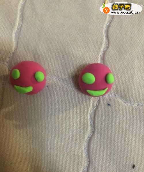 2分别粘到红色圆形上面,在拿出绿色的彩泥揉成两个弯弯的嘴巴。