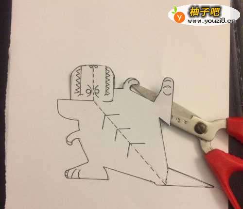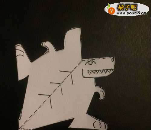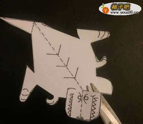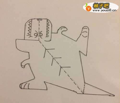 2选一只自己喜欢的恐龙画在纸上,或者打印出来。图中虚线的部分是一会要折叠的部分。