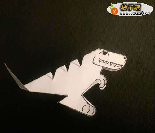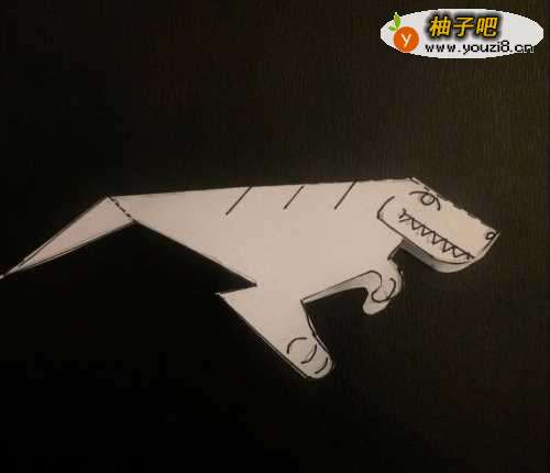 8然后把尾巴沿着虚线折叠,再把眼睛画黑。整理一下让恐龙站立起来。