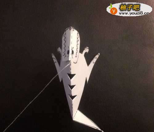 9接下来用针线穿过恐龙脖子处,提起来。这样提线纸恐龙就做好了。