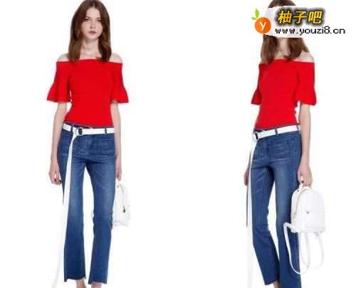 3红色一字肩短袖搭配牛仔裤,其中裤腰带子很有特色,非常修身的搭配,很允许彰显完美的身材,很有个性。
