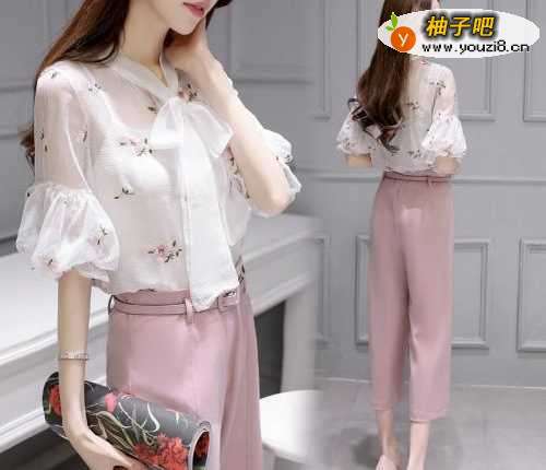 4雪纺荷花边短袖搭配浅粉色阔腿裤,非常优雅而且很有气质。