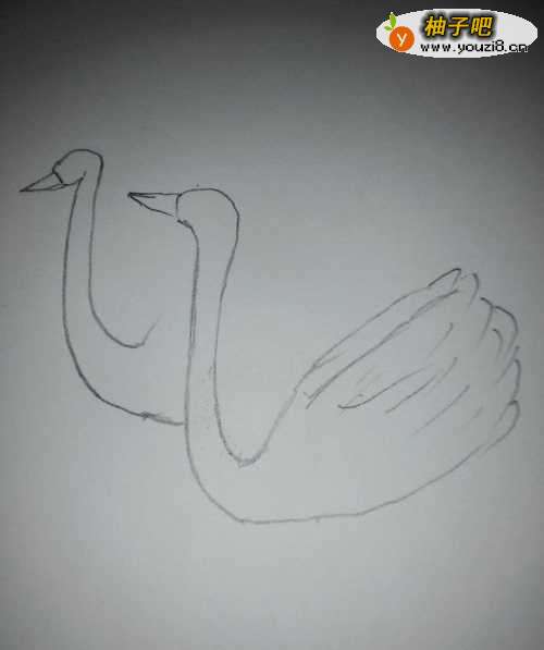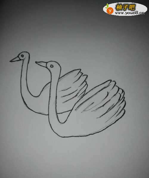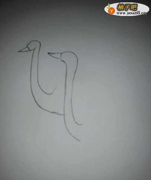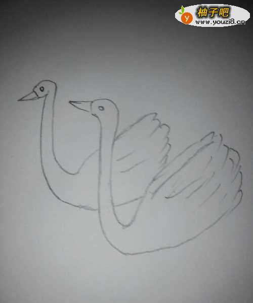 3接着我们用同样的办法来画出第二只天鹅的嘴巴和脖子,为何要在这个时候来画第二只呢,因为这个时候涉及到了身子的描画,在两只天鹅回重叠的时候,必须要先把外面这一只画了在画里边的那一只。