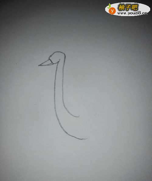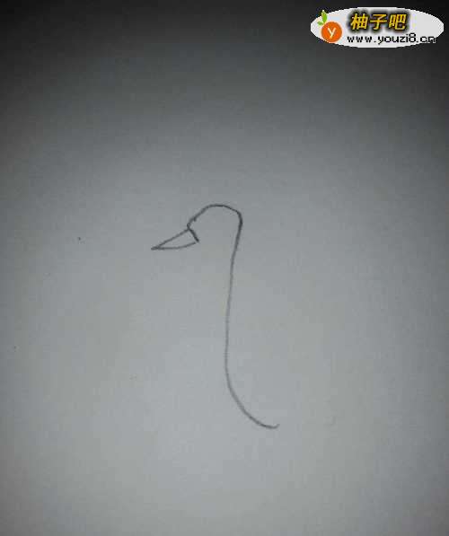 我们先 拿起笔来画出天鹅的嘴巴,注意它的嘴巴是尖尖的,扁平状,有区别于鸡的嘴巴。