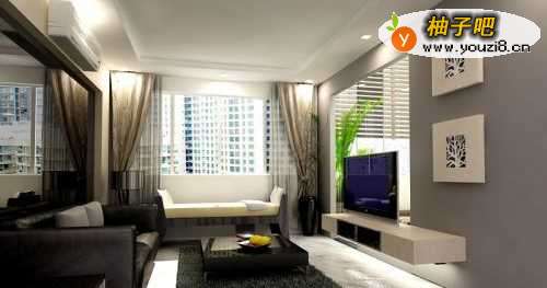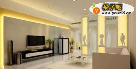 如果客厅的户型不是特别大,能用电视背景墙来扩宽视觉效果,还能用斜边截面来修饰柱子,同时也延伸视觉