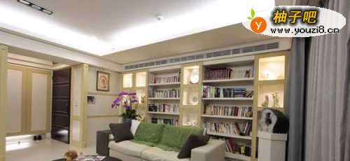 能将沙发背景设计成整面的大功能装饰柜,能同时收纳书籍、收藏品、照片等。同时也让软装饰品摆件有发挥的空间。