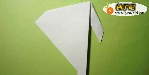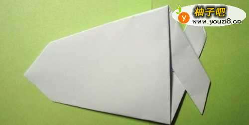 5然后,把折纸下边的纸边向上折一次,压平整,这是折出热带鱼的尾巴,如下图所示。