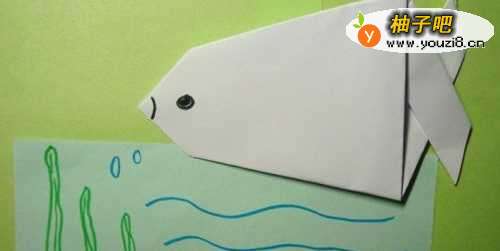 6最后用黑色彩色笔在折纸上画出眼睛和嘴巴,并在裁出的白纸边上,画出水草和水纹,放在折纸热带鱼的下边。组成了七彩热带鱼的场景折纸了。