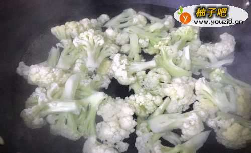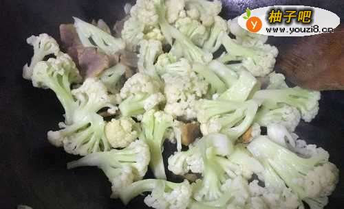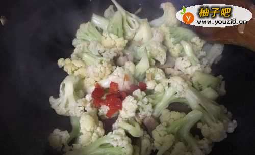 6紧接着将沥干水分的花菜倒进锅里进行翻炒,大火翻炒过程中能加少量的水,否则可能会因为太干,花菜烧焦。