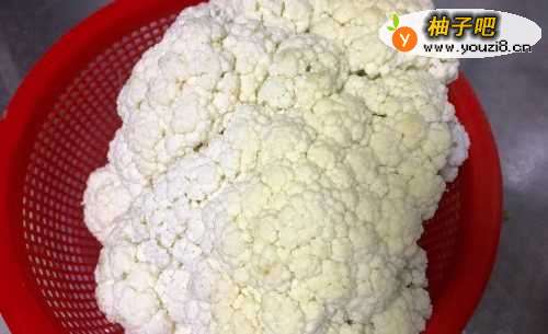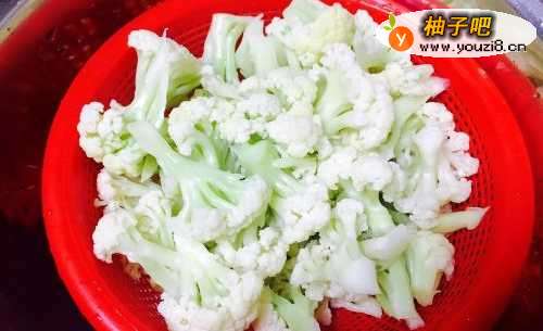 首先将花菜掰成小朵洗净后用盐水泡30分钟,此步骤是为了消毒。