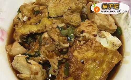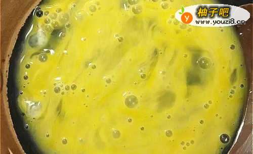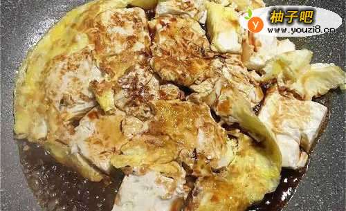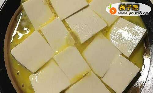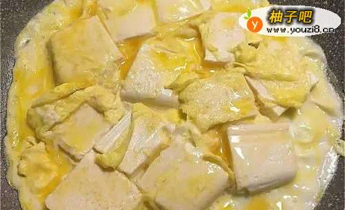 3锅热放油倒入蛋液豆腐,煎熟蛋液后翻面,再打散一颗蛋液淋在上面续煎。