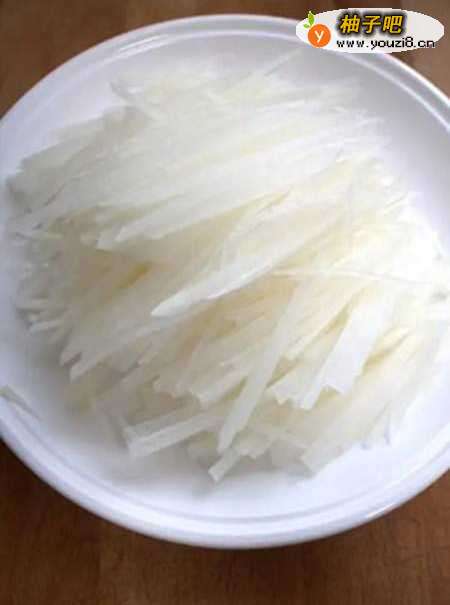 2.再把白萝卜去皮擦成丝,放入适量的盐腌制一下。
