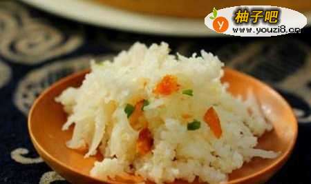 6 .再将裹有米粉的萝卜丝放入蒸屉上,一层萝卜丝,撒上些虾仁粒,重复拌三四次,最后在表面撒上些虾仁粒。