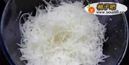 4 .然后把白萝卜丝加入盐后渗透水分, 再用纱布挤去一半的水分。